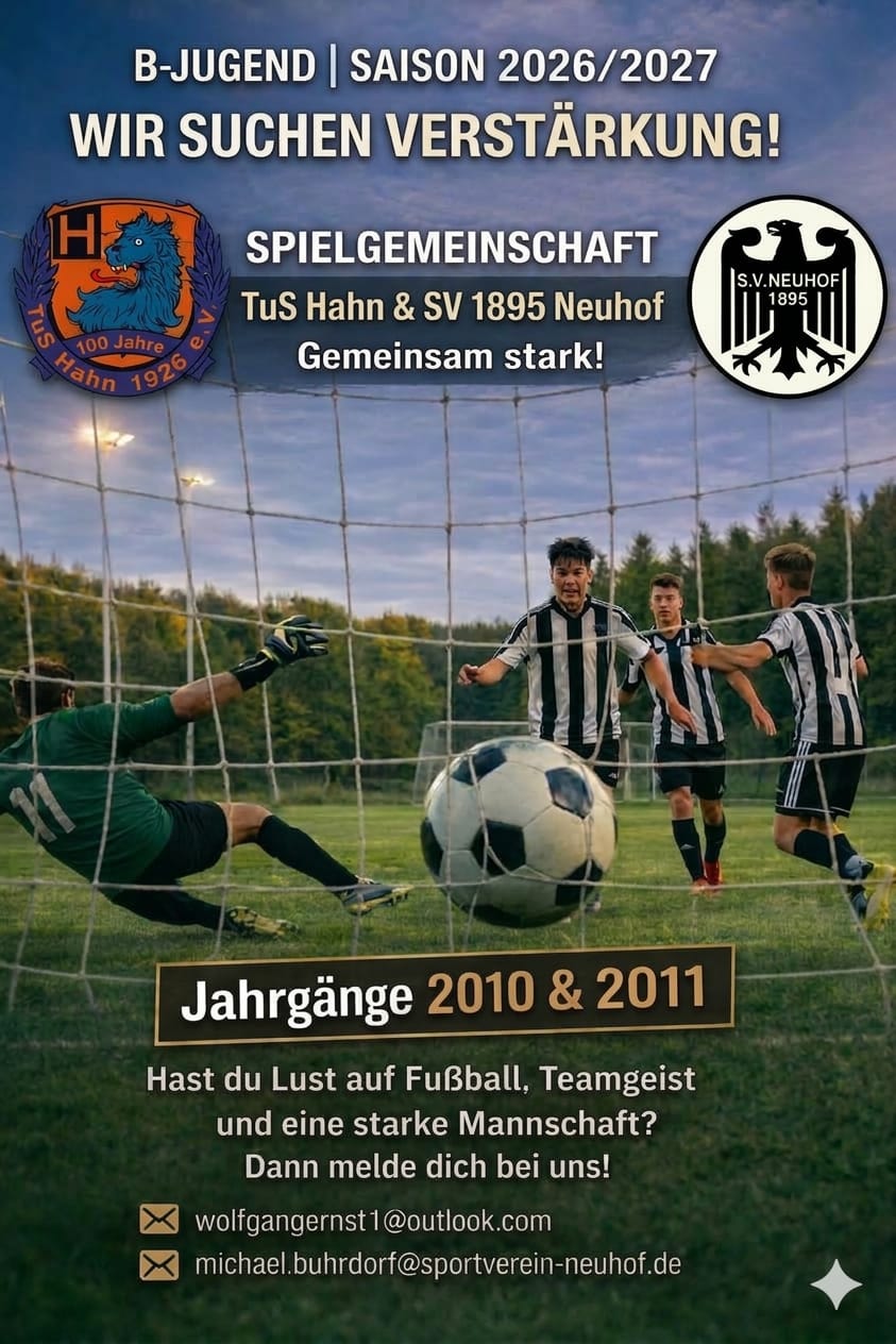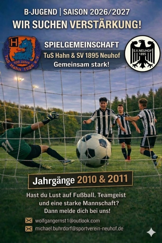 Zur Saison 2026/2027 stellt der SV Neuhof gemeinsam mit dem TuS Hahn eine B-Jugendmannschaft, um allen Taunussteinern, insbesondere den Jugendlichen aus Neuhof und Hahn eine Spielmöglichkeit zu bieten.